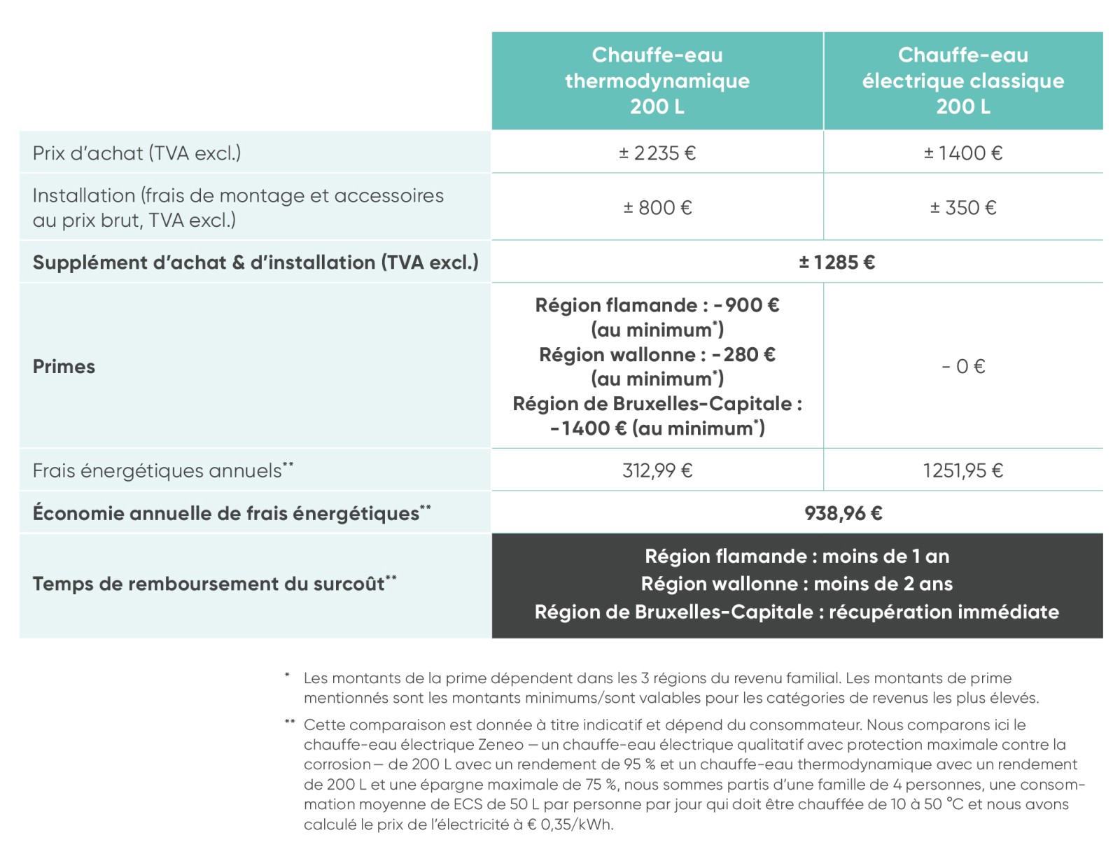 Grâce aux économies importantes sur la consommation d’énergie, cet investissement est entièrement amorti en un peu plus d’un an.En outre, un chauffe-eau thermodynamique donne droit à une prime dans les trois régions, ce qui permet de récupérer encore plus rapidement le surcoût. À Bruxelles, vous récupérez presque immédiatement la différence. En Flandre et en Wallonie, le temps de retour sur investissement est de 1 à 2 ans.